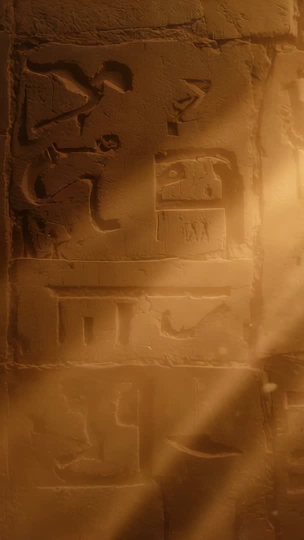 AI Generated Video. Vertical video capturing rising warm light slowly revealing carved ancient glyph panels in museum display. Camera panning upward while light shafts cutting across textured stone relief and dust motes drifting through beam, creating cinematic, atmospheric mood. Warm amber toning emphasizing fine masonry texture and shallow depth, offering strong contrast between highlighted carvings and shadowed grooves. Useful for archaeology documentary openers, museum exhibit promos, cultural heritage stories, history features, educational clips. Ideal for vertical social media content, Instagram Reels, TikTok background, app splash screens, and title overlays where vertical framing enhances mobile viewing. Composition offering negative space for text captions or logo placement. Postproduction ideas: boost warmth, add subtle vignette, increase texture clarity to highlight carvings, and introduce soft film grain to enrich period atmosphere.