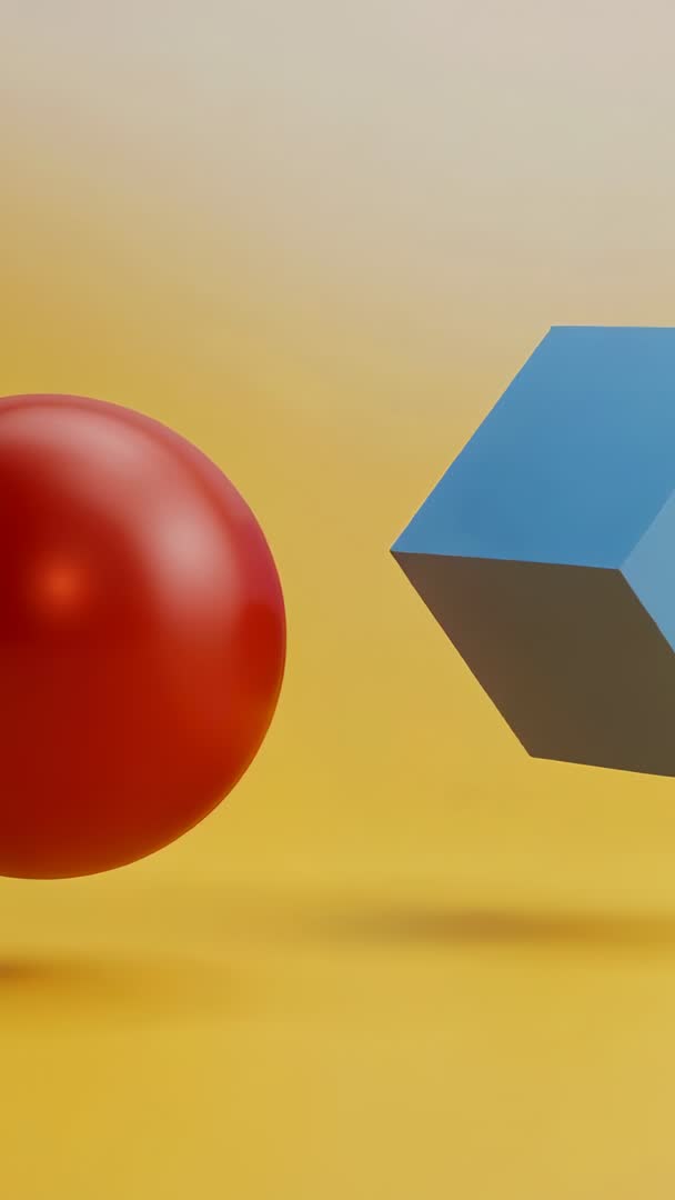 AI Generated Image. Featuring rotating blue cube and floating red sphere over warm yellow floor, minimalist render delivering clean geometry and bold color contrast. Displaying glossy reflective surfaces and soft studio lighting, creating subtle highlights and depth. Vertical format optimized for mobile stories and social media reels, working well for app backgrounds, product promos, animated ads, and motion design showreels. Loop-ready clip allowing seamless repetition for backgrounds, banners, and UI animations. Supporting modern branding and editorial layouts, enhancing web hero sections, presentation slides, and video thumbnails. Editable source fitting motion designers, marketers, and content creators needing simple abstract visuals for campaigns and presentations. Providing ample negative space for text overlays, logos, and lower thirds. Suggested uses: Instagram Stories, TikTok, YouTube Shorts, mobile app intro, product demo background, advertising spot, corporate opener.