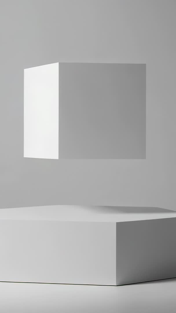 AI Generated Image. Presenting rotating white cube hovering above hexagonal pedestal in clean minimalist studio space. Suiting product showcase, technology intro, branding reveal, UI mockup, architecture visualization, and motion design. Providing tall vertical framing optimized for mobile platforms like Instagram Reels, TikTok, Stories, and mobile ads. Allowing easy overlay of logo, text, or 3D product, and enabling loopable animation or still frame extraction for print and digital design.