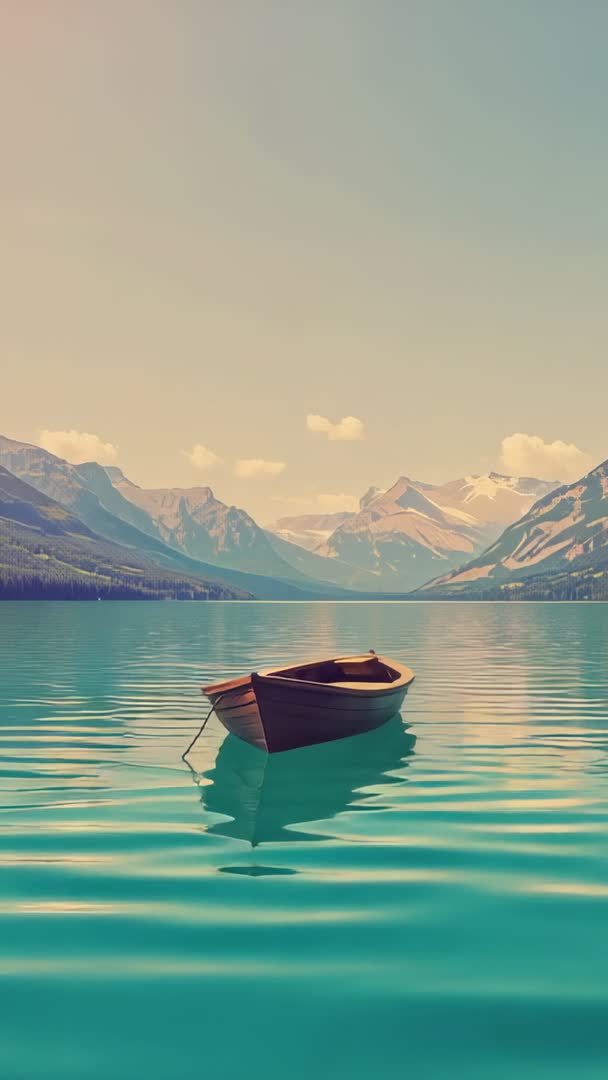 AI Generated Image. Clip showing wooden rowboat drifting toward viewer across turquoise alpine lake at dawn, reflecting soft golden light and distant snowcapped peaks. Shot featuring gentle ripples, mirrorlike reflections, and wide vertical composition for mobile and social reels. Mood evoking solitude, calm, reflection, and outdoor escape. Serving as background for meditation apps, travel promo reels, wellness retreats, hotel hero banners, mobile wallpapers, screensavers, and social media vertical ads. Adding gentle slow zoom, ambient piano track, warm color grade, and minimal overlay text to enhance mood and viewer focus. Planning loop length at 10–30 seconds; exporting as vertical 9:16 for optimized mobile playback. Delivering versatile asset for editorial, commercial, and social use with strong visual storytelling and tranquil atmosphere.