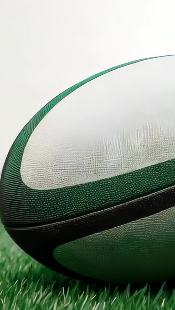 AI Generated Video. Showing close-up of rugby ball rotating on grass turf, revealing green stripes and textured surface. Providing vertical framing with ample copy space in upper area for logo or text overlay. Working well for social media reels, vertical ads, app intros, product showcase, sport event promos, store hero banners. Supporting slow-motion or looping edits to emphasize motion and tactile detail. Helping brand campaigns with strong green and black palette for team identity and seasonal marketing. Allowing cropping for widescreen thumbnails or tall mobile formats.