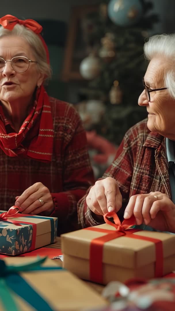 AI Generated Image. Senior couple wrapping holiday gifts, tying neat red ribbons and sharing warm smiles. Close-up on hands forming bows, blurred Christmas tree and ornaments in background creating cozy atmosphere. Plaid clothing and red scarf adding traditional holiday style. Useful for holiday marketing, greeting card video, social media reels, DIY wrapping tutorials, senior lifestyle campaigns, care home seasonal promotions. Recommended format: 9:16 vertical video for reels, stories and short-form ads. Editing ideas: loop short bow-tying clip for repeatable reel, add soft acoustic music and warm color grade, overlay holiday caption and logo in lower third. Licensing uses: commercial seasonal ads, ecommerce gift pages, blog headers, lifestyle newsletters, holiday email campaigns.