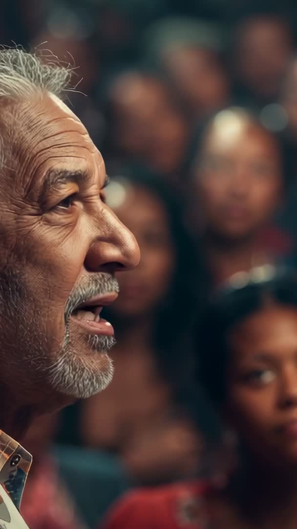 AI Generated Image. Close-up vertical clip showing senior male speaker addressing blurred audience from left profile while wearing bright patterned shirt. Vertical composition providing tall frame and copy space on right for titles, captions, lower thirds. Ideal for promoting public speaking workshops, lecture series, leadership talks, community events, corporate training, educational content, documentary segments, news features, social media reels and stories. Editing suggestions including adding lower third with speaker name, applying gentle warm color grade, using slow push-in or reveal to increase drama, adding subtitles for mobile viewers. Emotional tone conveying experience, wisdom, authority and community connection, usable for marketing, educational, editorial and inspirational projects.