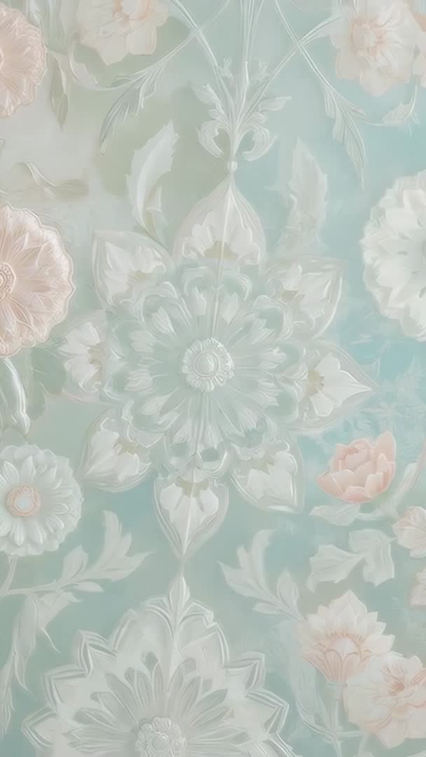 AI Generated Video. Camera shifting across embossed floral wallpaper revealing medallion seam and delicate pastel textures in mint and ivory. Close-up vertical clip highlighting raised ornamental pattern, soft matte finish and subtle shadows from embossed details. Clip working well as looping background for vertical content, product showcase, social media Stories or Reels, interior design reel, wallpaper catalog preview, boutique branding or wedding stationery video. Recommend slow smooth pan, gentle color grading, overlaying minimal text in upper third, and using 9:16 crop for mobile-first delivery. Mood conveying calm, elegant, vintage-inspired decor and tactile craftsmanship.