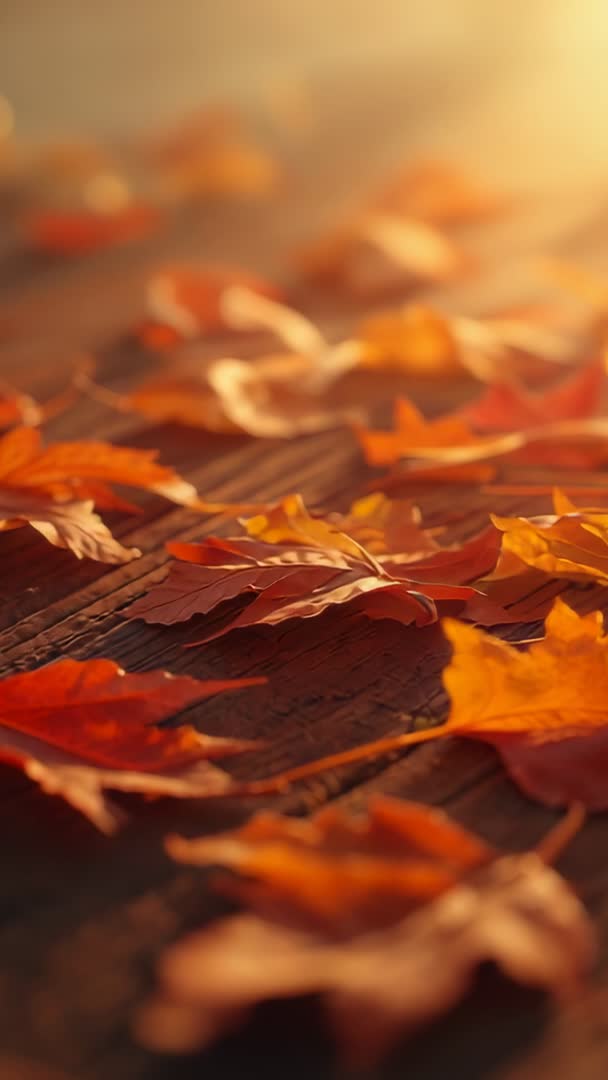 AI Generated Image. Vertical video showing shifting focus across red and orange maple leaves on weathered wooden deck, creating warm bokeh and soft golden highlights. Warm tones and shallow depth of field creating cozy, nostalgic autumn mood with rich leaf texture. Ideal for mobile backgrounds, social media stories, vertical ads, seasonal promos, and greeting card intros. Looping-friendly composition and cinematic shallow focus making clip useful for overlays, title sequences, and website hero banners. Color palette complementing fall campaigns, lifestyle blogs, and interior decor mockups.