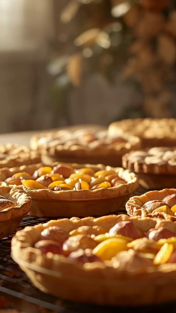 AI Generated Image. Shifting camera focus across rustic fruit tarts on wire rack at countertop, showing flaky crust, glossy glazed fruit, and delicate sugar dusting under soft warm light. Camera movement creating shallow depth of field and gentle bokeh, highlighting texture and handcrafted detail. Ideal for bakery ads, recipe reels, social media verticals, cooking tutorial B-roll, menu visuals, seasonal campaign content, and product packaging previews. Use looped clip for background motion, add title overlay and ambient music for lifestyle storytelling, or apply slow motion for close-up texture study. Pair with copy about homemade baking, artisanal pastry, cozy kitchen mornings, and farm-to-table fruit.