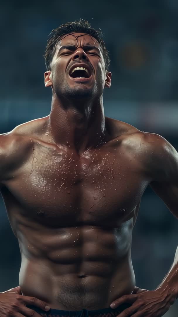 AI Generated Image. Vertical 9:16 video clip showing shirtless athlete shouting and gasping after bell in arena, sweat glistening on chest and abs. Camera framing focusing on torso and face, droplets flying and slow-motion detail highlighting physical strain and intense emotion. Use for sports promos, fight night openers, boxing or MMA highlight reels, gym and trainer ads, fitness influencer reels, motivational social content, broadcast bumpers and commercial spots. Production tips: crop for mobile vertical formats, add bell hit and heavy exhale audio for punch, apply cinematic color grade and contrast to enhance muscle definition, overlay bold call-to-action text for ad campaigns. Ideal for conveying endurance, victory, exhaustion and raw athletic power.