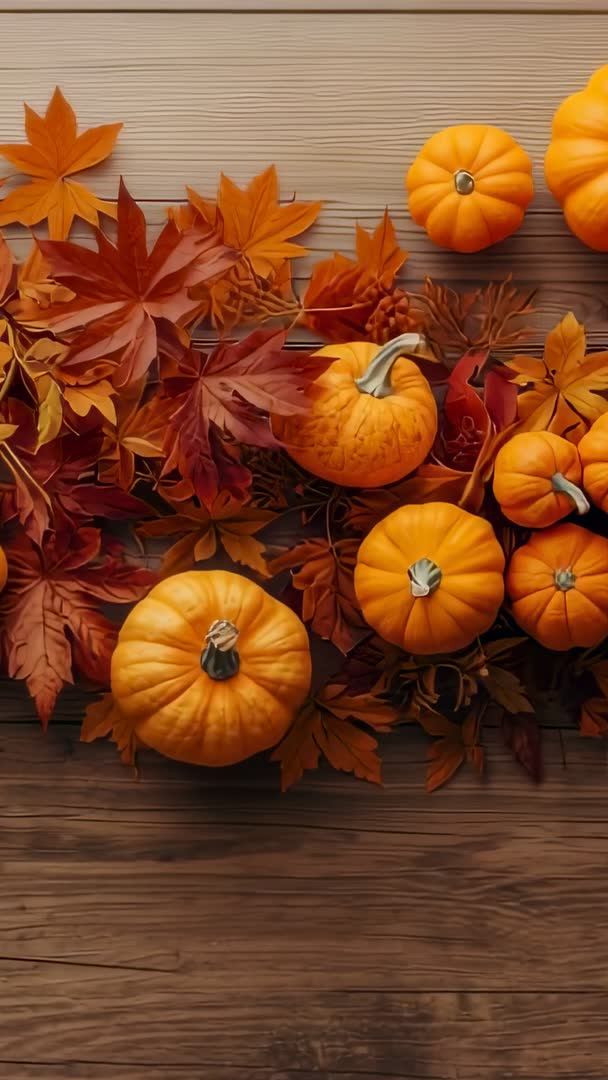 AI Generated Image. Vertical clip focusing on small orange pumpkins and layered fall leaves on rustic wooden tabletop, camera slowly panning top to bottom while highlighting warm autumn tones and rich wood grain texture. Ideal for seasonal social media reels, Instagram and TikTok stories, website banners, email headers, Thanksgiving and harvest festival promotions, recipe videos, farmers market advertisements, and home decor blogs. Design tips: leaving negative space at bottom for logo or call-to-action, adding warm acoustic music or ambient nature sounds, applying gentle slow zoom or looping for seamless background. Color palette working well with earth tone typography and hand-lettered overlays to create cozy, inviting branding.