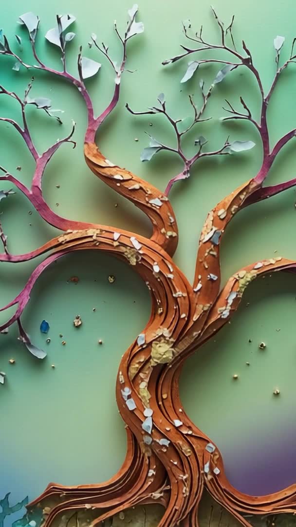 AI Generated Image. Vertical video showing close-up of layered wooden tree sculpture mounted on gradient panel, highlighting intricate wood grain, layered construction, and paint chipping for tactile texture. Scene working well for art and design editorial, craft tutorials, gallery promotion, product background for interior decor brands, social media reels, museum exhibition promos, and online shop hero visuals. Color palette blending warm wood tones with mint to purple gradient, creating calm modern aesthetic that complements minimalist interiors and creative branding. Framing allowing full vertical crop for mobile-first platforms while maintaining detail in trunk and branching silhouette. Suggestions for use: pair with slow pan or slight zoom for cinematic feel; add soft ambient soundtrack and subtle camera movement for handcrafted vibe; overlay simple typography and logo for promotional clips or title cards. Licensing suitable for commercial and editorial campaigns, lifestyle blogs, interior design portfolios, and promotional material for makers and craft studios.