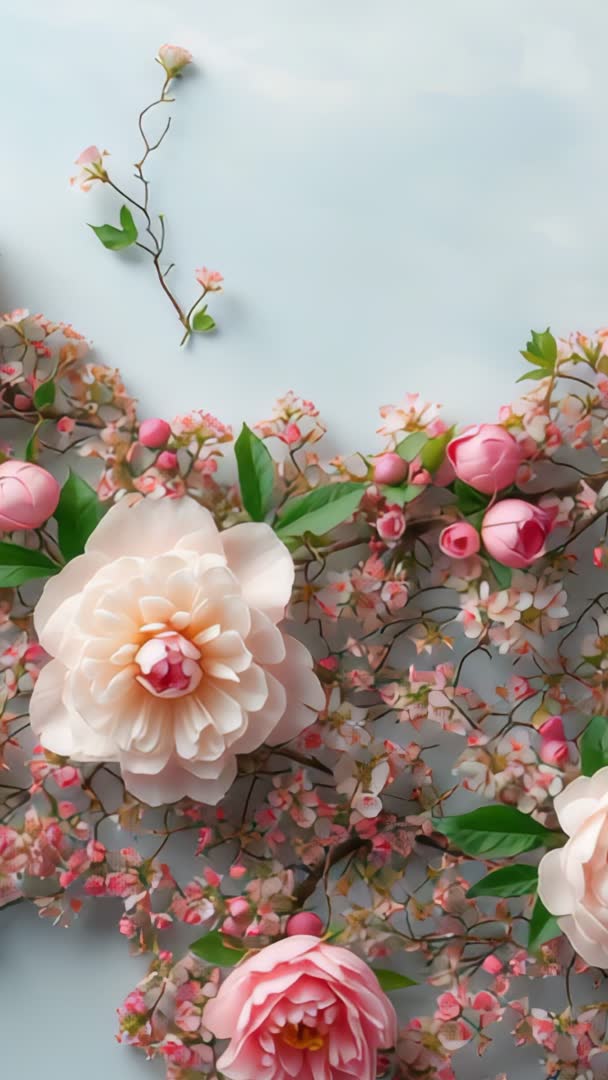 AI Generated Image. Presenting overhead flatlay of pink camellia blooms and tiny blossom branches on soft pastel background. Camera remaining still to highlight petal texture, layered composition, and gentle color gradient. Lighting staying soft to create calm, elegant mood. Working well for social media stories, wedding invitation backgrounds, beauty packaging, seasonal marketing, greeting card templates, and mobile vertical ads. Cropping for portrait orientation and looping for ambient background in retail display or event projection. Pairing with light serif typography, subtle logo animation, or minimalist call-to-action overlay for refined branding. Delivering as looped MP4 or animated GIF for easy web and social integration. Suiting header video on lifestyle blog, hero section on florist website, background for product showcase, and moodboard presentations.
