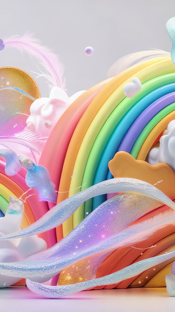 AI Generated Image. Vertical motion clip showcasing pastel rainbow arch gliding through soft cloud puffs, foam shapes, and sparkling glitter ribbons. Color palette blending gentle pastels with bright accents, creating playful, dreamy, and surreal mood. Elements moving with smooth parallax and subtle light shimmer, optimized for looping and vertical display. Use for boosting engagement on social media reels and stories, elevating vertical ads and product intros, supporting children content and beauty brand campaigns, serving as mobile wallpaper or animated background for event promotions and streaming overlays.