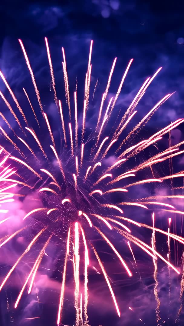 AI Generated Image. Footage capturing vibrant pink chrysanthemum fireworks exploding into radial spark trails against deep blue night sky, with drifting smoke and soft bokeh highlights. Vertical 9:16 composition optimizing use for mobile-first platforms, reels and stories. Ideal for promoting festivals, holiday events, concert intros, party invitations, New Year and Fourth of July campaigns. Applying color grading and overlaying bold titles or countdown timers to create dramatic openers and social clips. Loop-friendly segments working as background for music videos, live event montages and celebratory ads.