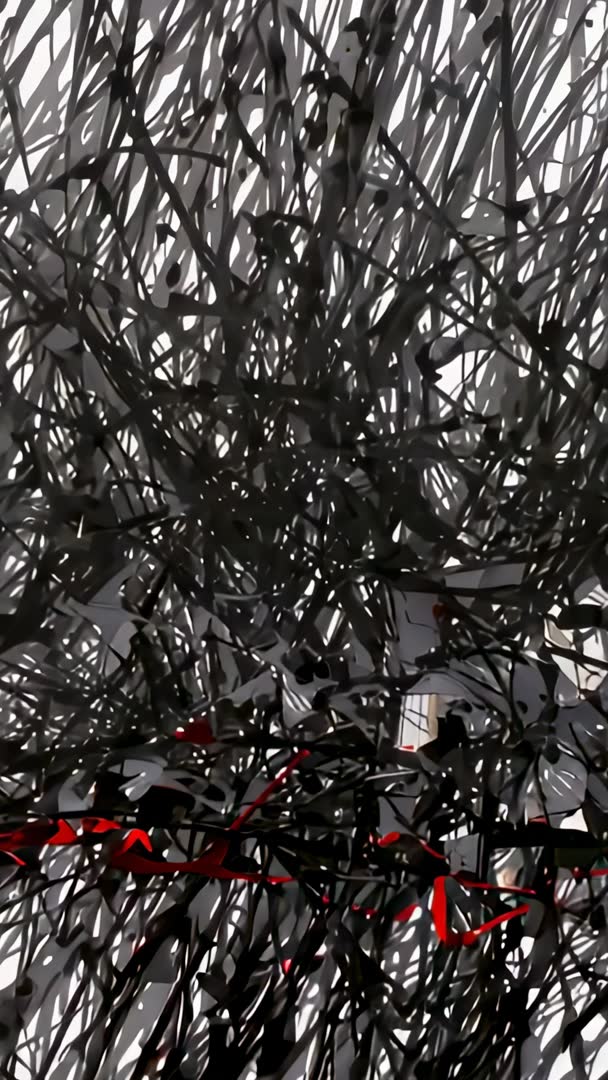 AI Generated Video. Hanging abstract assemblage of black wires forming dense network with red strand weaving through frame. Contrasting monochrome palette with sharp red accent creating visual tension and focal point. Filming vertically, composition emphasizing height and layered depth, optimized for portrait screens and social reels. Minimal motion and high contrast making footage easy to loop, color grade, and overlay text or graphics. Usage ideas include background for creative websites, gallery promotion loops, editorial spreads, music video visuals, product advertising with modern aesthetic, and motion graphics projects. Suggest pairing with ambient soundtrack, trimming for seamless loop, or exporting select frames for wall art prints and marketing collateral.