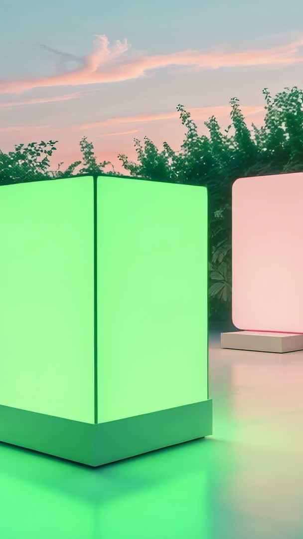 AI Generated Image. Video showing two modern LED cube lights on patio at sunset, front left cube shifting to vibrant green while rear cube glows soft pink. Composition featuring minimalist lines, leafy backdrop, reflective floor creating subtle color reflections and calm visual rhythm. Mood conveying contemporary ambiance suited for evening entertaining, lifestyle branding, or design portfolios. Technical notes: vertical 9:16 orientation, short clip capturing color shift at third second with loopable aesthetic for social media. Usage ideas: use for Instagram Reels, TikTok, mobile ads, app splash screens, event promos, lighting or furniture product demos, architecture and interior design presentations, mood boards, and ambient music video backgrounds.