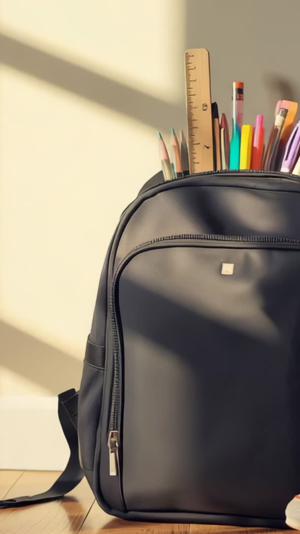 AI Generated Image. Vertical video showing close-up of black backpack filled with colorful pencils, pens, wooden ruler, sunlit shadows casting across smooth backpack surface and wooden floor. Featuring vertical framing, warm natural light, soft contrast, minimal composition, and calm neutral background. Including space on left side for text overlays, lower thirds, or brand logo for easy customization. Working well as opener clip, loopable background for social media reels, product mockups, online education promos, and school supply ads. Ideal for back-to-school campaigns, study and organization articles, creative workspace inspiration, e-commerce banners, and lifestyle editorials. Capturing simple everyday school scene with focus on texture, color pops, and inviting warm mood.