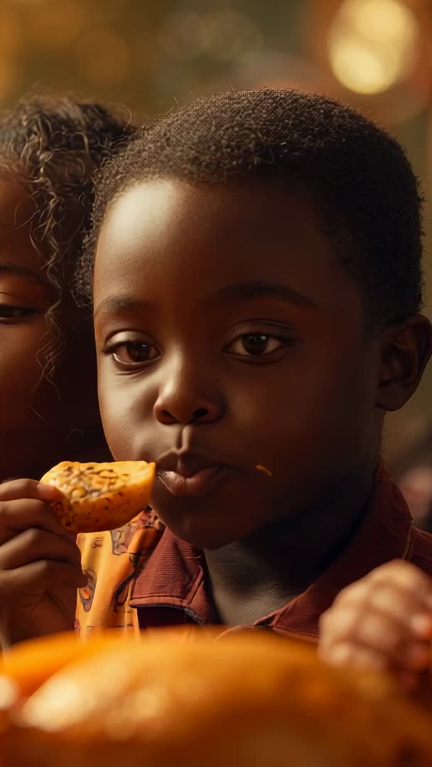 AI Generated Image. Vertical video capturing Black boy nibbling seeded cracker at family dinner beside roast bird, warm bokeh lighting creating cozy, rustic mood. Close-up framing conveying childhood wonder, family togetherness, and food enjoyment. Vertical format optimizing mobile consumption and short-form video platforms, suiting social media reels and short promotional clips. Suiting holiday campaign, restaurant or food brand content, family lifestyle editorial, parenting blog banners, recipe video openers, and seasonal marketing. Color palette and warm tones supporting messaging about comfort, tradition, and belonging.