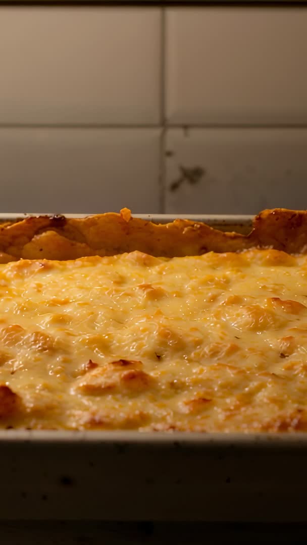 AI Generated Video. Close-up vertical clip showing bubbling cheese gratin cooling in rectangular bakeware on kitchen counter with tiled backsplash. Cheese settling and forming golden crust while steam rising and glossy melted surface shimmering. Warm color palette enhancing golden tones and crisp browned edges. Ideal for cooking tutorials, recipe reels, menu promos, restaurant social posts, and blog hero headers. Friendly vertical composition fitting mobile stories and reels with space for text overlays or logo at top or bottom. Suggestions for use: add recipe steps, ingredient list, voiceover narration, or slow-motion cheese pull insert. Suitable for culinary brands, food packaging mockups, and editorial food features.