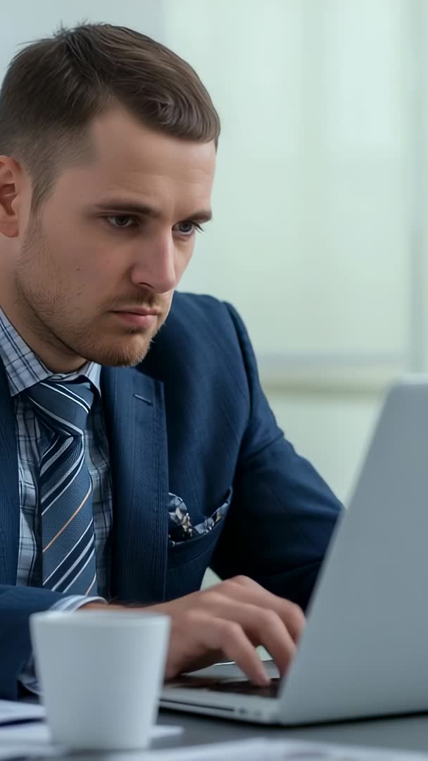 AI Generated Video. Vertical clip showing business professional in navy suit leaning over laptop, typing and scanning screen with intense focus. Close-up on face and hands, shallow depth of field, natural office light, coffee cup on desk in foreground. Clip working well as B-roll for corporate videos, productivity tutorials, finance or legal service promos, app demo reels, LinkedIn and Instagram vertical ads, TikTok and Instagram Reels. Use for training modules, onboarding presentations, website hero loops, pitch decks, executive profile sequences, or business blog headers. Editing suggestions: shorten to 6-15 seconds for social, add captions and lower-third text, loop for continuous background, color grade to cool tones for corporate feel, add ambient office audio or subtle keyboard sounds. Technical notes: portrait 9:16 framing, close-up composition, ideal for mobile-first vertical campaigns and short-form social content.
