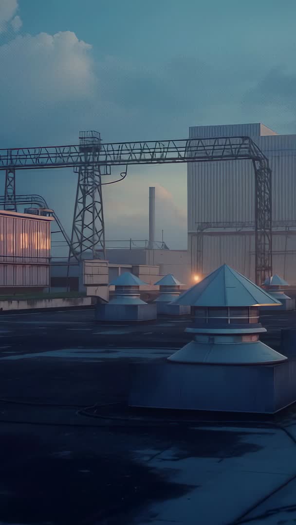 AI Generated Image. Camera moving forward toward conical rooftop vent at dusk, warm lamp glow highlighting metal surfaces and roof vents. Industrial gantry and piping forming layered silhouette against blue hour sky, composition emphasizing foreground vent while background factory structures adding depth and cinematic mood. Working well for corporate manufacturing presentations, HVAC and ventilation product demos, urban infrastructure features, industrial safety and maintenance training, environmental and emissions reporting, cinematic sequences for film and game projects, mobile vertical ads and social media reels. Providing moody rooftop backdrop for title screens, background loops, parallax website headers, b-roll in documentaries, and marketing assets focused on industry, architecture, or urban technology.