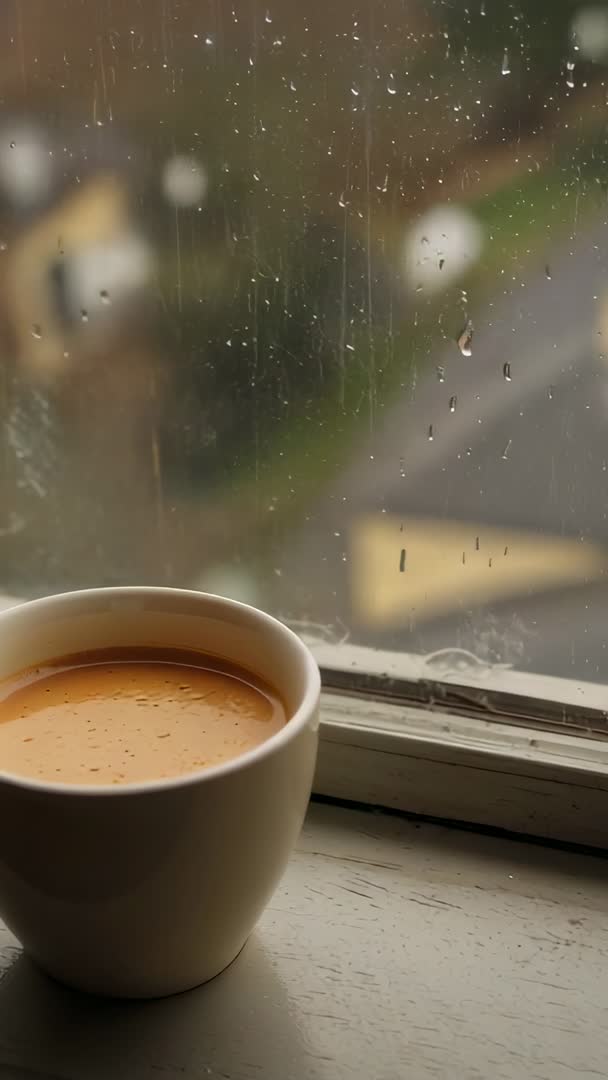 AI Generated Video. Video capturing ceramic mug resting on painted windowsill during gentle rain, with droplets sliding down glass and blurred street beyond creating soft bokeh. Warm color palette and shallow depth of field emphasizing mug rim and liquid surface while background recedes into muted shapes. Offering generous vertical copy space for title text, captions, or branding overlays along upper frame. Working well for social media stories, Instagram reels, TikTok, mindfulness and wellness content, cafe branding, lifestyle b-roll, and seasonal or rainy day campaigns. Useful as background for quote graphics, product ads, website hero headers, calm transition shots, and editorial pieces about cozy home life.