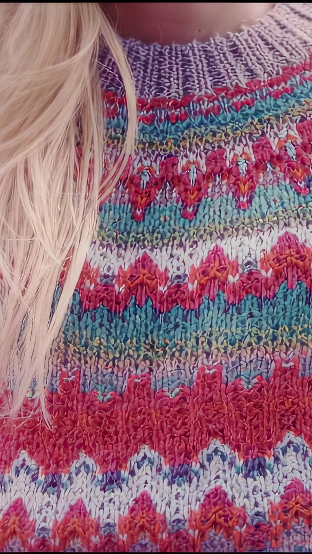 AI Generated Video. Showing vertical close-up of colorful zigzag knit sweater and flowing blonde hair, camera remaining fixed. Rich texture and layered colors creating cozy tactile mood. Cropping working well for smartphone vertical formats, leaving top area for text overlay and branding. Looping short edit working well for social media reels, stories, and ads. Clip suiting knitwear catalogs, fashion product pages, seasonal marketing, blog banners, and mood boards. Color palette pairing warm reds with cool teals offering bold visual contrast for branded content. Lighting remaining soft and even, emphasizing stitch detail and fabric depth.