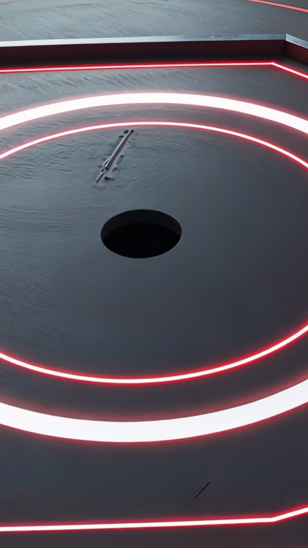 AI Generated Video. Displaying concentric neon rings in red and white circling central circular opening on matte dark platform. Featuring subtle reflections, clean minimal geometry, and high contrast illumination for cinematic look. Working as loopable vertical clip for tech intros, mobile ads, social media stories, app previews, and VJ loops. Serving as background for title overlays, product reveals, UI mockups, and futuristic branding content. Allowing easy color grading, speed ramping, and text placement along ring paths for dynamic motion design. Pairing well with electronic, synthwave, or ambient soundtracks to enhance modern digital mood.