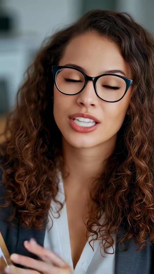 AI Generated Image. Featuring close-up of young professional woman with curly hair and black glasses speaking while holding clipboard at desk, presenting ideas with expressive mouth movement and calm demeanor. Framing vertical for mobile-first platforms and portrait social content. Useful for corporate training videos, employee onboarding, leadership coaching, communication skills workshops, webinar intros, and customer-facing presentations. Suitable for social media ads, LinkedIn stories, Instagram Reels, TikTok clips, remote work tutorials, online courses, and pitch videos. Editing suggestions: add lower-third title, subtitles for mobile viewers, B-roll of office scenes, and light background music to enhance engagement and retention.
