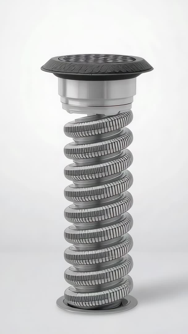 AI Generated Video. Vertical studio video showing corrugated metal drain bellows flexing and compressing into housing beneath rubber strainer. Close-up composition focusing on coil movement, textured ridges, and seal engagement, ideal for product demonstration and technical documentation. Footage working well for plumbing manufacturer catalogs, ecommerce product pages, installation guides, engineer presentations, and social media vertical ads. Suggested use: overlay text callouts, slow-motion replay, cutaway diagrams, voiceover explaining function and installation steps, loopable compression cycle for product reels. Lighting neutral, background minimal, enabling easy compositing and graphic overlays.