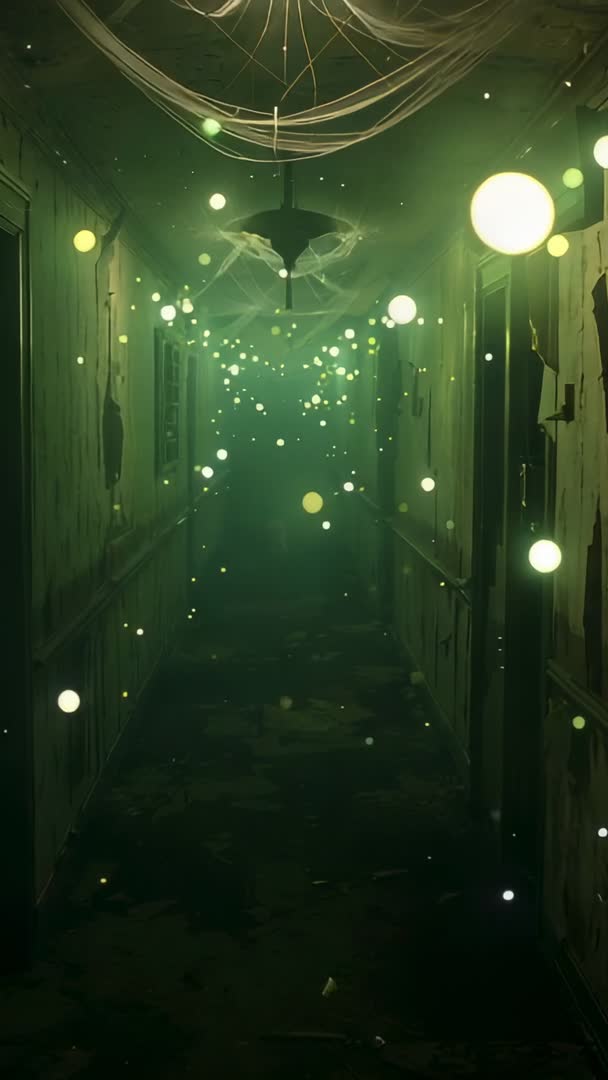 - Vertical video showing eerie abandoned corridor with drifting green orbs and ghostly bat silhouette