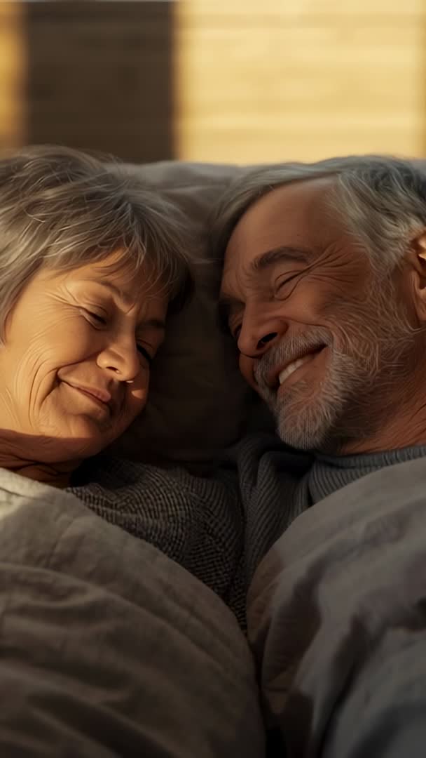 - Vertical video showing elderly couple dozing in sunlit bed, smiling and sharing warm intimacy