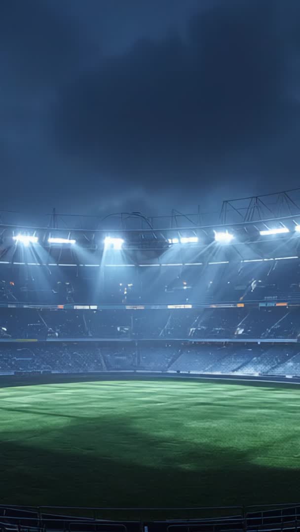 AI Generated Image. Vertical video showing empty sports stadium interior with green pitch glowing under powerful floodlights and heavy cloud cover. Stadium bowl remaining dark except for bright beams cutting through mist, creating dramatic cinematic atmosphere. Video working well as opener for sports broadcasts, match promos, ticketing ads, venue rental pages, countdowns, social media stories, and mobile ads. Suggested usage including adding slow upward tilt or gentle push-in to build tension; overlaying bold headlines or match details within center safe area; layering crowd ambience and orchestral build for cinematic impact; applying cool blue color grade to enhance contrast and mood. Technical notes: optimizing for 9:16 vertical aspect, leaving center area for text and logos, retaining highlight detail near floodlights, preserving beam effect. Ideal for promotional reels, broadcast bumpers, event marketing, esports intros, and stadium tour clips.