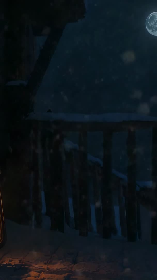 - Vertical video showing falling snow coating cabin porch railing under full moon with lantern glow