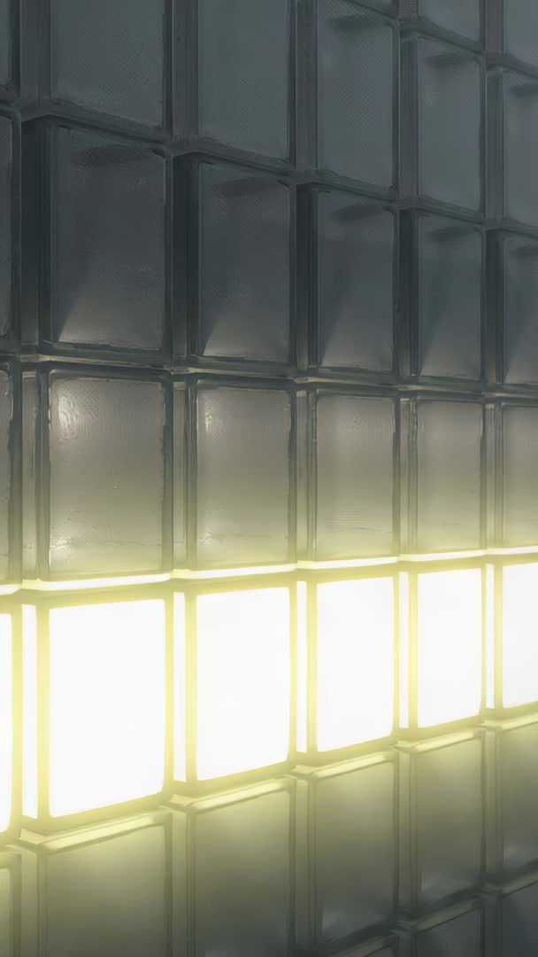 AI Generated Video. Showing frosted glass block wall reacting to light switching on along lower band of corridor, creating horizontal glowing ribbon against muted grid. Camera holding vertical orientation and slowly panning, framing square panels, textured translucency, and subtle reflections. Lighting creating contrast between illuminated lower row and darker upper rows, evoking mood, privacy, and modern industrial aesthetic. Working as ambient background for architecture presentations, interior design reels, lighting product showcases, corporate transitions, hospitality or retail concepts. Ideal for vertical social media ads, app hero screens, website hero sections, stock video libraries, and editing as loopable clip or intro.