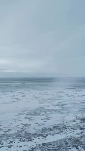 - Vertical video showing frozen tidal flat on overcast coastline, documenting shoreline change