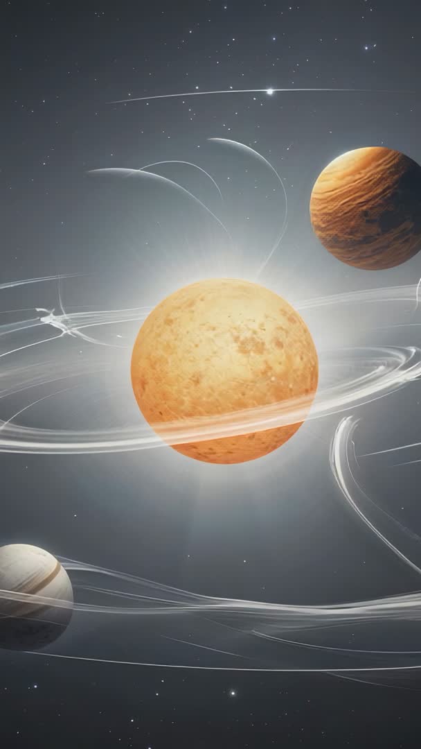 AI Generated Image. Vertical video showing glowing yellow-orange star at center surrounded by drifting translucent orbital rings and rotating planets against dark starfield. Illustrating orbital motion, gravitational flow and cinematic planetary animation with soft glow and directional light. Providing tall composition ideal for mobile-first projects, social media stories, vertical ads, app splash screens and channel intros. Offering clean negative space around central star for text overlay, logo placement or lower-third graphics. Working well for educational content on astronomy and astrophysics, conceptual science visuals, planetarium previews and sci-fi trailers. Featuring warm planet tones contrasted with cool space backdrop for striking visual impact. Delivering loopable ring motion potential for seamless background or motion graphic loops.