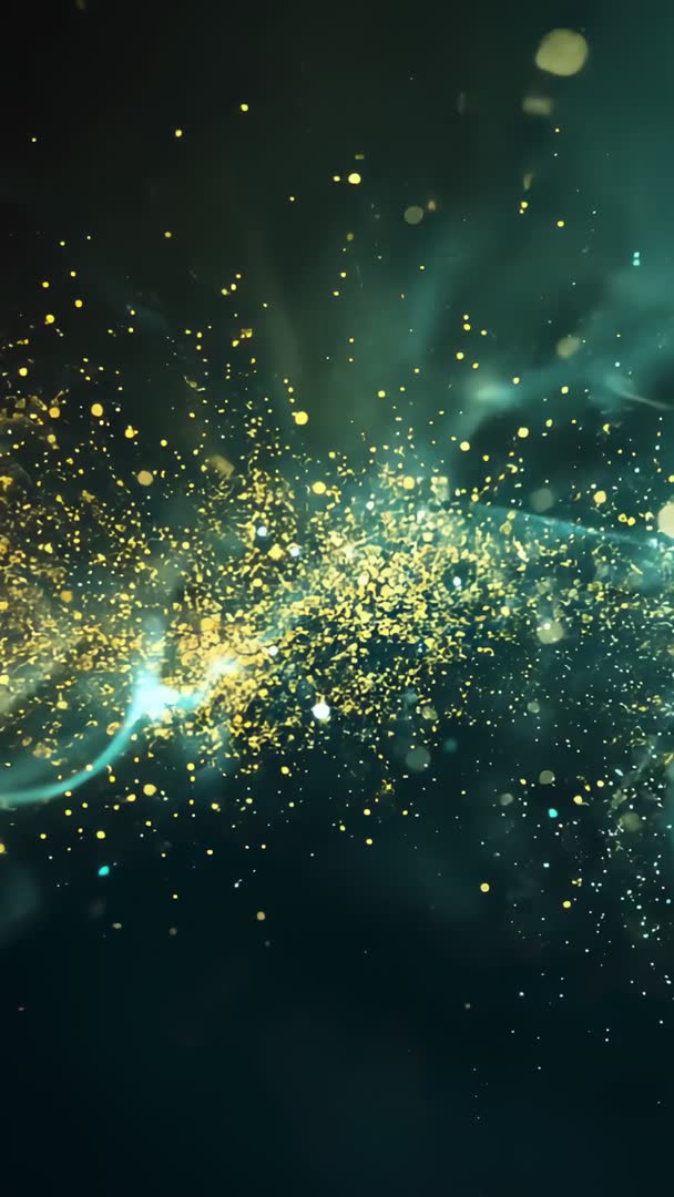 Vertical video showing gold particle cloud shifting into teal smoke ribbon with bokeh Video