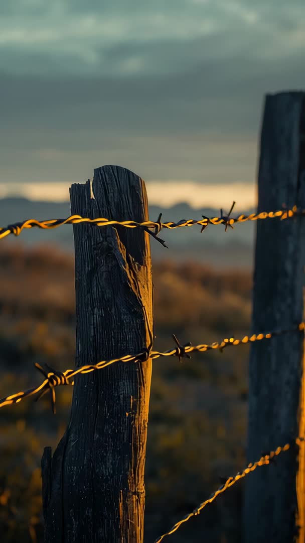 AI Generated Image. Showing close-up of weathered wooden fence post with barbed wire catching warm golden hour light while camera slowly zooming. Background featuring soft out-of-focus grassland and distant mountains, creating moody cinematic atmosphere. Ideal for use as B-roll for agricultural, ranching, conservation, rural lifestyle, and environmental storytelling. Working well for social media vertical reels, smartphone ads, website hero sections on mobile, documentary intros, and travel or outdoor tourism promos. Offering strong texture, contrast, and warm color palette for overlaying text, logos, or voiceover. Technical notes: vertical 9:16 orientation, shallow depth of field, warm backlight, slow zoom recommended. Licensing suggestions: editorial and commercial uses such as background footage for brand campaigns, product ads, seasonal promotions, and lifestyle content.