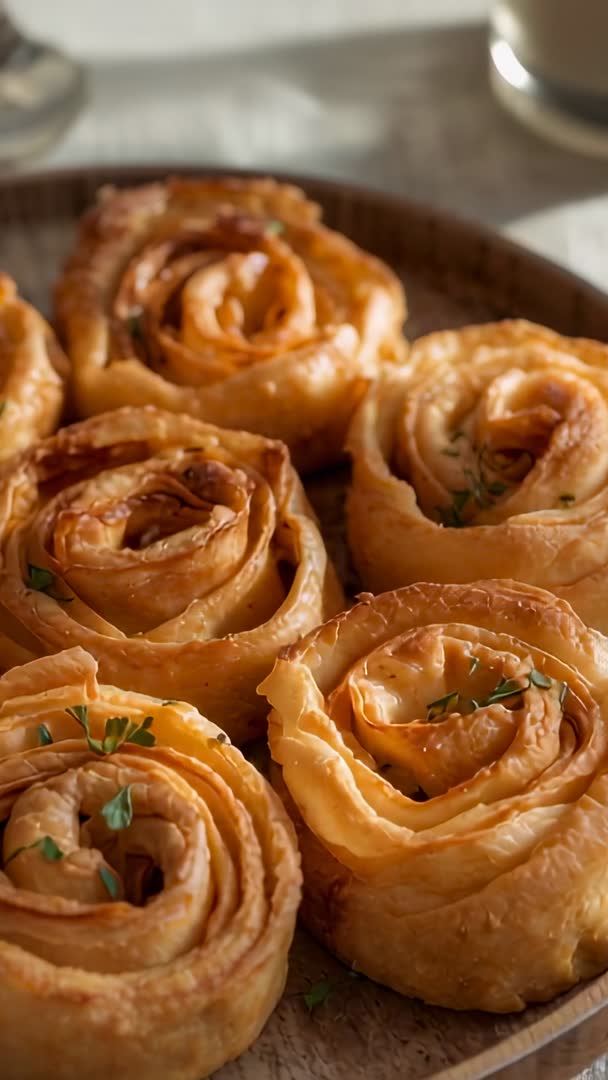 AI Generated Video. Showing close-up pan over six golden rose-shaped phyllo rolls arranged on rustic wooden board, tucking fresh herbs into spiral layers and highlighting flaky, crisp texture and warm golden tones. Working well as hero clip for recipe tutorials, fueling TikTok and Instagram reels, anchoring food blog headers, promoting restaurant menu videos, supporting bakery commercials, and illustrating how-to pastry guides. Suggesting slow 10-20% speed for dramatic motion, looping B-roll for social media, overlaying recipe steps and ingredient lists, adding soft acoustic music and subtle vignette to focus attention. Offering crop-safe composition for mobile vertical formats and high-resolution detail for thumbnails and marketing assets.