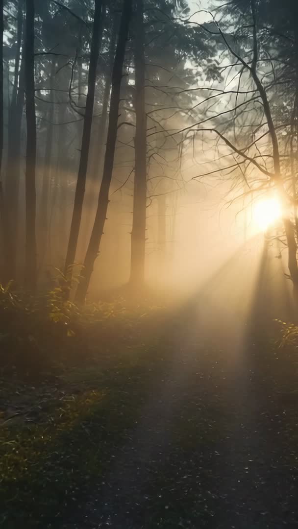 AI Generated Image. Showing golden sunbeams piercing mist-filled pine woodland, casting long warm rays across shadowed trail and ferns. Evoking mystical, tranquil, atmospheric mood with contrast between golden highlights and cool blue shadows. Working well for meditation and wellness apps, nature or travel promotional reels, social media vertical ads, phone wallpapers, and calm background scenes for title sequences or guided meditation videos. Providing natural space for text overlays or logo reveal using bright sun area for contrast. Looping-friendly composition with gentle light movement for seamless backgrounds. Suggesting slight warm color grade and subtle noise reduction to enhance cinematic feel. Suitable for commercials, web banners, spa and retreat promotions, and storytelling sequences in documentaries or short films.