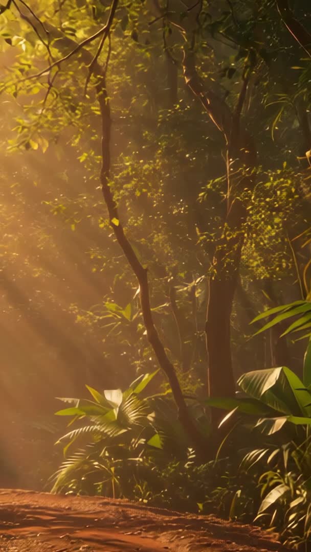 AI Generated Image. Vertical footage showing warm golden sun rays filtering through dense forest canopy above dirt trail, creating atmospheric beams and soft haze. Scene evoking tranquility, solitude, and sense of natural wonder. Ideal for nature documentaries, eco tourism promotions, wellness and meditation apps, environmental campaigns, and social media vertical content. Vertical framing suiting reels, stories, mobile ads, and cinematic intros. Editing tips: enhancing warm tones, boosting contrast, and slightly increasing clarity to emphasize light rays and foliage texture. Sound ideas: using ambient nature field recordings, soft piano, or gentle acoustic guitar to reinforce peaceful mood. Licensing suggestions: using as hero background, opening scene, transition clip, or overlaying text for inspirational messages.