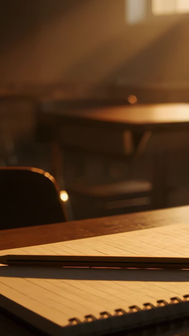 AI Generated Image. Showing warm golden sunlight falling across spiral-bound notebook and pencil on school desk, creating calm study mood with soft classroom bokeh. Composition highlighting foreground notebook lines and pencil edge while background desks remain out of focus, evoking concentration and quiet learning moments. Useful for educational and back-to-school content, study tips and productivity videos, vlog B-roll, and social media reels or shorts. Use as opening clip for online course, overlay text for study quotes or tips, background for voiceover about learning strategies, or cover clip for blog and ebook about student life. Vertical format optimized for Instagram Reels, TikTok, YouTube Shorts, and mobile learning apps; color palette and shallow depth of field working well for nostalgic, focused, or calming themes.