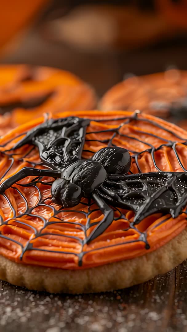 AI Generated Image. Starting close-up on sugar cookie decorated in orange web icing and glossy black spider piped in thick icing. Pulling back slowly to reveal additional decorated cookies in soft background blur, highlighting texture of frosting and glossy details. Featuring warm autumn tones, shallow depth of field, and mouthwatering close-up that reads well on mobile screens. Working well for Instagram Reels, TikTok, Pinterest Idea Pins, and vertical social ads. Ideal for bakery seasonal campaigns, Halloween recipe tutorials, party invitations, product packaging mockups, website hero banners, and promotional content for confectionery brands.