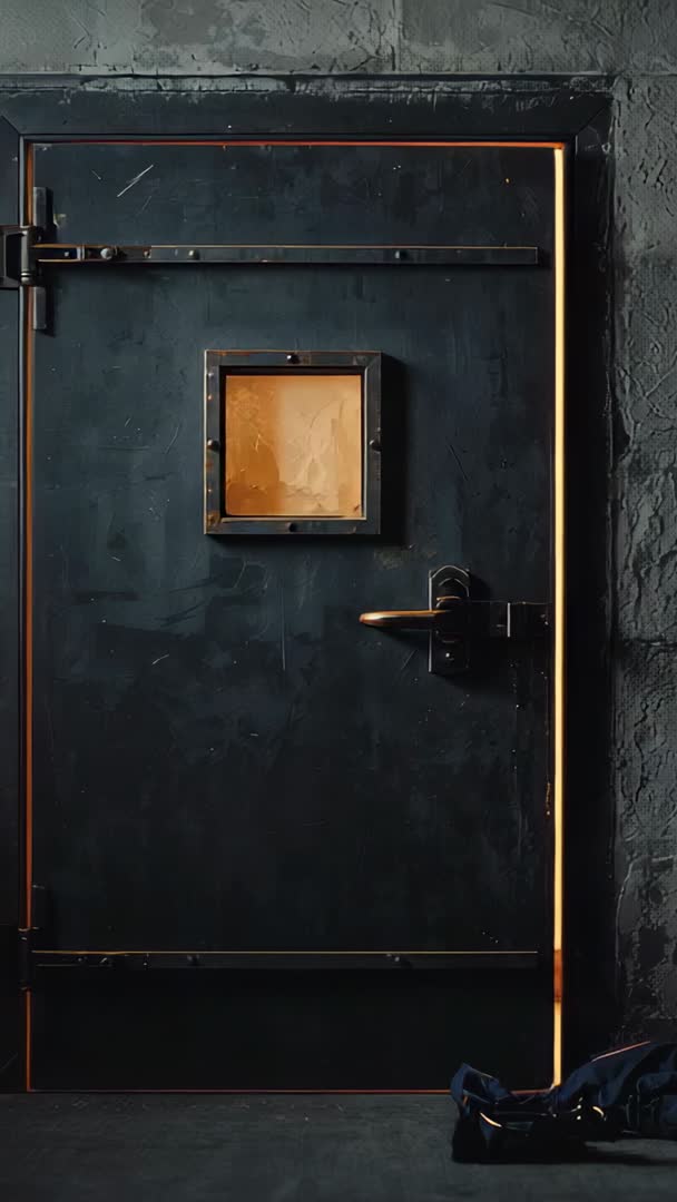 AI Generated Image. Vertical footage showing hand pushing steel cell door, letting warm amber light spill through small square porthole while bag rests on floor. High contrast backlighting and rim lighting creating moody, cinematic atmosphere with gritty textured wall. Footage working well for thriller trailers, true crime intros, security and safety campaigns, film and TV b-roll, and social vertical ads. Close-up details of latch and handle offering cutaway shots for transitions and overlays. Cropping and grading suggestions: keeping vertical 9:16 composition for mobile platforms, boosting warm highlights, deepening shadows, and adding subtle grain for filmic look. Using as background for title cards, promo teasers, mood-setting sequences, or stock footage libraries.
