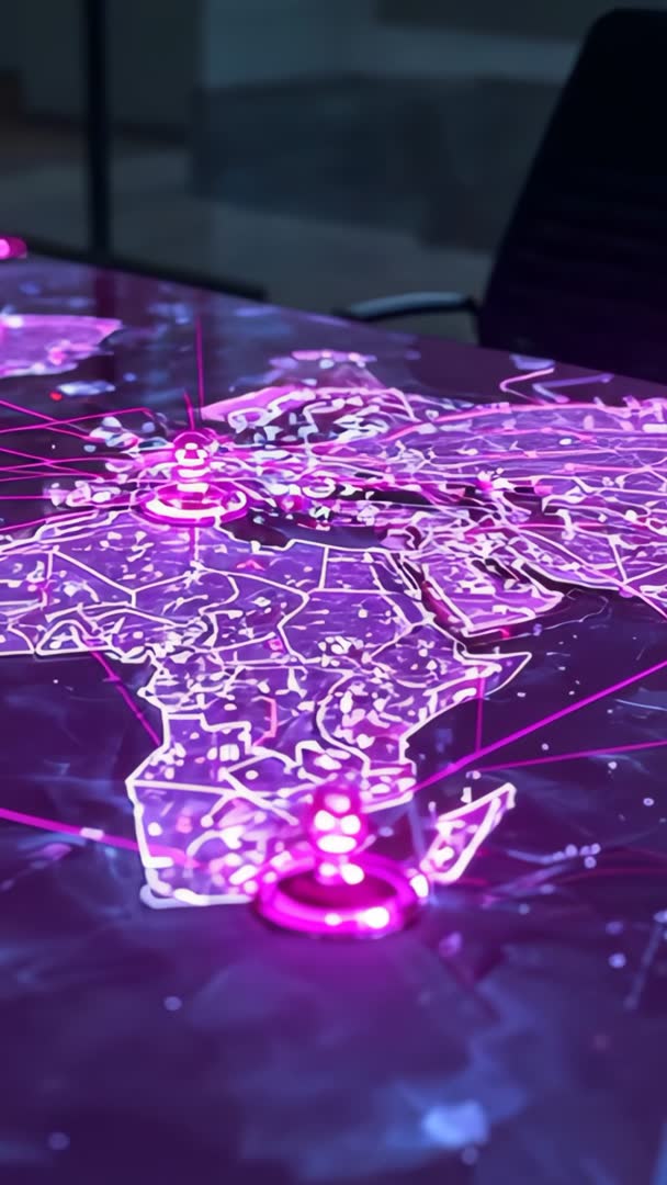 AI Generated Image. Vertical video showing holographic Africa map pulsing with neon nodes and connecting lines, visualizing data flow and network topology. Serving technology presentations, investor pitches, social media vertical ads, website hero sections, trade show displays, newsroom graphics and corporate reports. Overlaying animated labels or KPI callouts for metrics, highlighting node activity for telecom or logistics storytelling. Color grading options include enhancing neon magenta and violet tones for dramatic futuristic look or muting hues for professional corporate feel. Sound design suggestion: pairing electronic ambient score with synchronized node pulses for immersive effect. Targeting CTOs, IT managers, telecom marketers, data scientists and cybersecurity teams. Working well as loopable background, opener for explainer sequences, or dynamic visual for product demos and pitch videos.