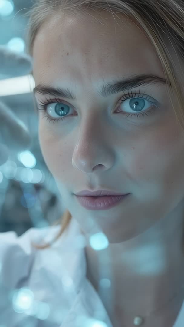 AI Generated Video. Capturing close-up portrait of researcher face with gloved hand aligning LED microstrand under cool blue lighting. Highlighting precision inspection, optical reflection in eyes, and delicate electronics handling for microassembly or sensor testing. Serving technology marketing, product demo, medical device testing, quality control tutorial, biotech presentation, startup pitch, editorial on women in STEM, and social media vertical ad use. Pairing minimal ambient music with on-screen captions for step-by-step inspection sequences. Recommending crop for mobile thumbnails, slow-motion excerpt for product detail, and color grade to enhance cool blue tones and emphasize technical focus.