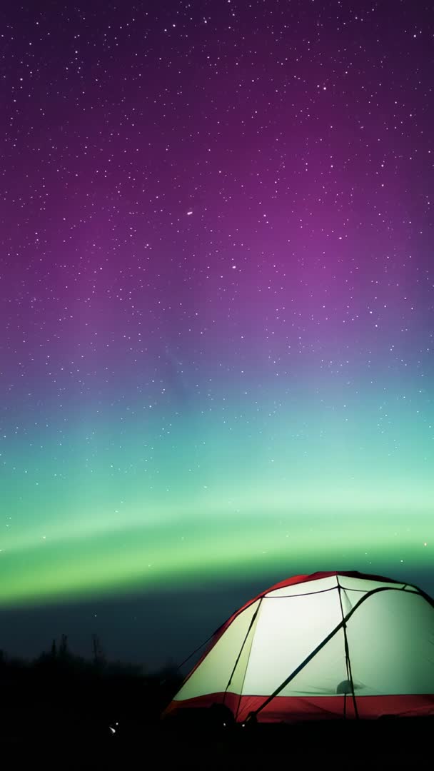 - Vertical video showing lit dome tent camping under shifting northern lights and starry sky