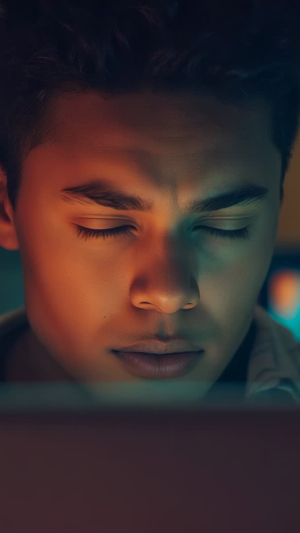 AI Generated Image. Showing close-up vertical video of young man closing eyes and furrowing brow while screen glow casts warm and cool tones on face. Conveying eye strain, digital fatigue and deep concentration during extended device use. Serving as footage for eye health campaigns, screen time awareness stories, remote work and study narratives, and technology product promotions. Enhancing social media reels, app intros, website hero sections, corporate training videos, and healthcare presentations. Allowing editors to crop for portrait or wide formats, add color grade overlays, insert titles, or use as B-roll for narrative sequences focused on stress, focus, or introspection.