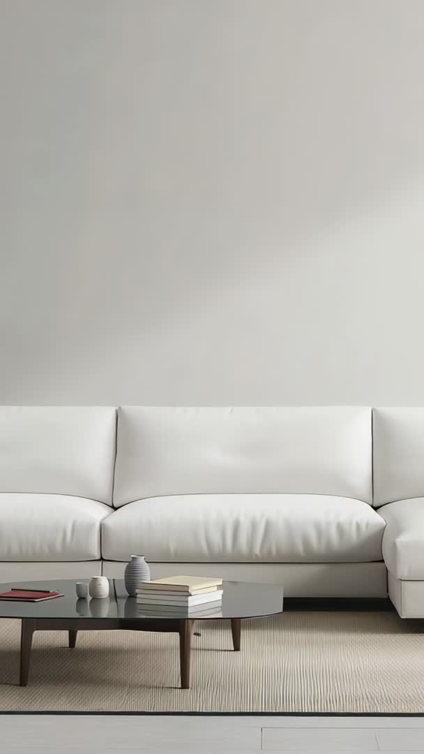 AI Generated Image. Footage showing minimalist living room with white sofa, low coffee table, ceramic vases and stacked books. Vertical 9:16 frame creating ideal composition for social media stories, reels, TikTok and mobile ads. Neutral color palette and soft natural light creating calm, elegant mood while leaving generous blank wall space for text or logo overlay. Camera holding steady mid shot, allowing smooth pan or slow zoom for cinematic effect. Use cases include promoting furniture and home decor brands, showcasing interior design projects, enhancing real estate listings, providing background for lifestyle or wellness content, creating branded social ads and quote graphics. Editing suggestions include adding subtle color grade, soft ambient music, text overlay aligned to upper wall space, and slow motion for relaxed pacing. Licensing suggestions include commercial campaigns, website hero banners, social media vertical ads and product previews.
