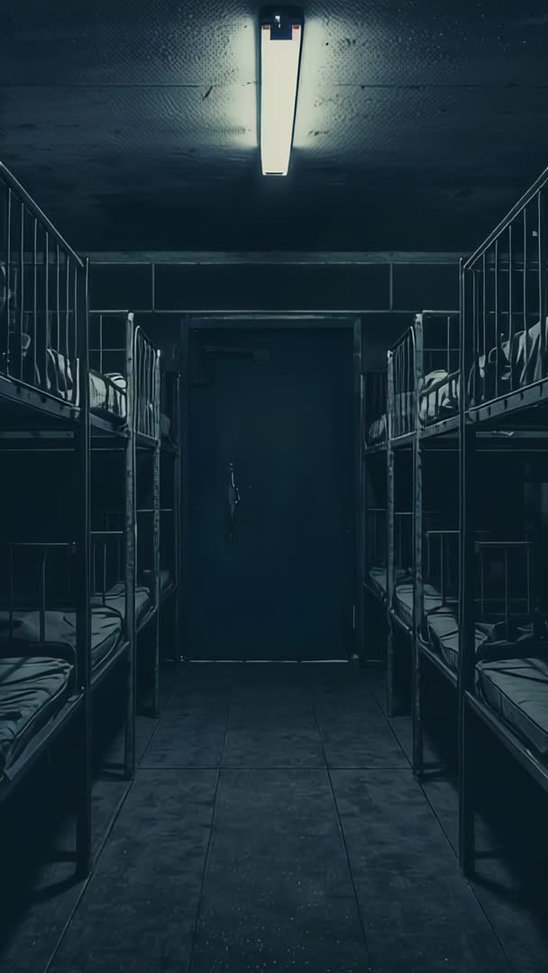 AI Generated Image. Video showing empty narrow dormitory corridor lined with stacked metal bunk beds, central locked metal door, and single overhead fluorescent light casting cold tones and deep shadows. Composition emphasizing symmetry and vanishing point, creating tense, isolated mood ideal for suspense. Use for vertical social media content such as Instagram Reels, TikTok, and mobile ads needing cinematic, moody visuals. Suitable for thriller or horror trailer backgrounds, documentary segments about institutional or communal living, architecture and interior design mood pieces, hostel or barracks promotional clips, game environment references, and editorial imagery for stories on housing, shelters, or military life. Technical highlights include vertical 9:16 frame, low-key lighting, and strong leading lines for overlaying text, voiceover, or title graphics.