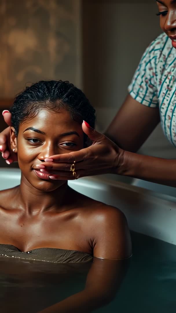 AI Generated Video. Showing intimate vertical sequence of mother gently cupping bather mouth while offering calming touch during bath. Employing warm low-key lighting and close-up framing to highlight skin tones and tender expression. Serving wellness, maternal care, postpartum support, spa and skincare campaigns, parenting articles, mental health promotion, caregiver training. Fitting for vertical social media ads, Instagram Reels, TikTok, mobile web hero video, commercial spots, editorial use. Suggesting licensing for lifestyle advertising, healthcare outreach, bath product packaging, spa service promotion, family-centered storytelling. Adding soft ambient music and gentle voiceover for calming narrative. Allowing trimming to 15-30 second clips for social platforms and looped background for wellness apps.